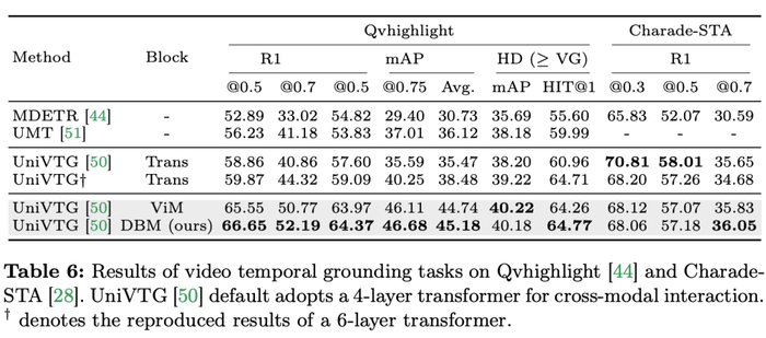 研究团队不仅关注了单模态任务,还评估了 Mamba 在跨模态交互任务中的性能。论文中采用视频时间定位(VTG)任务评估了 Mamba 的表现。所涉及的数据集包括 QvHighlight 和 Charade-STA。