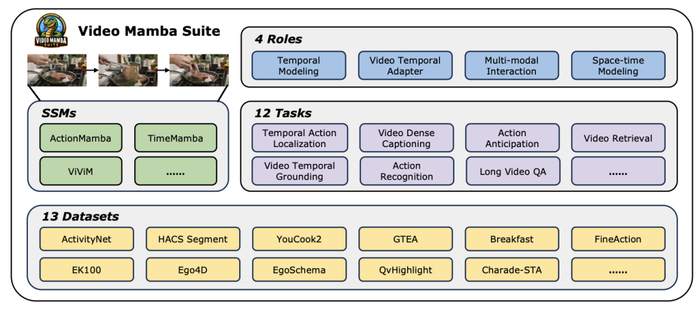 为了克服这些局限,并全面评估 Mamba 模型在视频理解领域的潜力,研究团队精心打造了 video-mamba-suite(视频 Mamba 套件)。该套件旨在补充现有研究的不足,通过一系列深入的实验和分析,探索 Mamba 在视频理解中的多样化角色和潜在优势。
