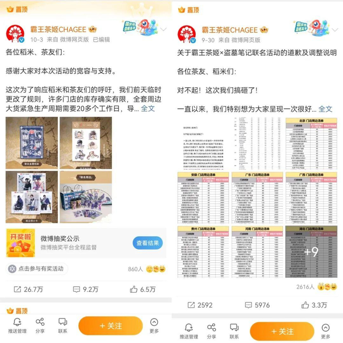 去年霸王茶姬与盗墓笔记的联名活动中,因买赠规则设置不合理、门店联名产品数量不足、不了解IP粉丝消费习惯等原因,导致消费者“未买先骂”,怨气十足。事件发酵后,霸王茶姬官方作出道歉,表示针对大家的不满,品牌会对联名活动规则做出整改,并追加10000份「霸王茶姬 x 盗墓笔记全套联名周边」进行抽奖发放。