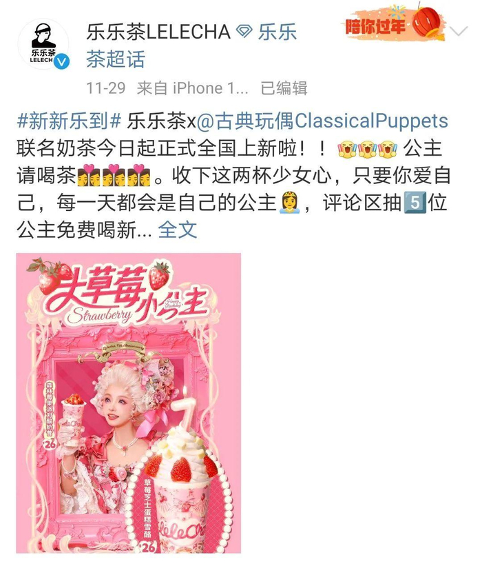 去年,乐乐茶官宣与古典玩偶联名,在推出限定新品的同时,发起“专属小公主的赠礼”活动,用户只要身穿Lolita小裙子到店就能够领取联名周边。从联名对象和粉色系的周边以及让用户穿Lolita装就能领周边的活动,就能看出,乐乐茶此次联名活动大概率主要是面向女性用户。