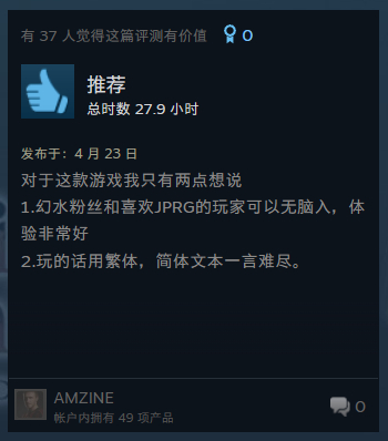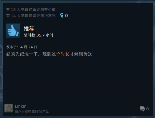 此外,还有一名玩家,在游戏时长 12.5 小时评价说:必须纪念一下,终于解锁传送了。