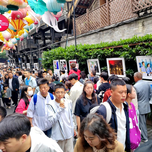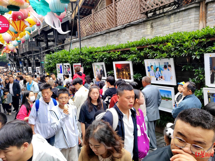 “五一”期间的成都宽窄巷子游人如织,市民游客欣赏特色建筑、品尝特色小吃、享受休闲文化的同时,还能观看这里展览的一幅幅摄影作品。