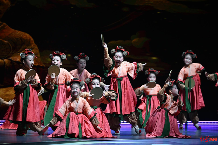 这是来自四川眉山18名小学生出演的《执镜俑》舞蹈,她们身着橘红色长裙,手持一面铜镜、头戴两朵配花,随着音乐响起,这群小“陶俑”逐渐苏醒,扑闪着眼睛观察这个千年后的世界。