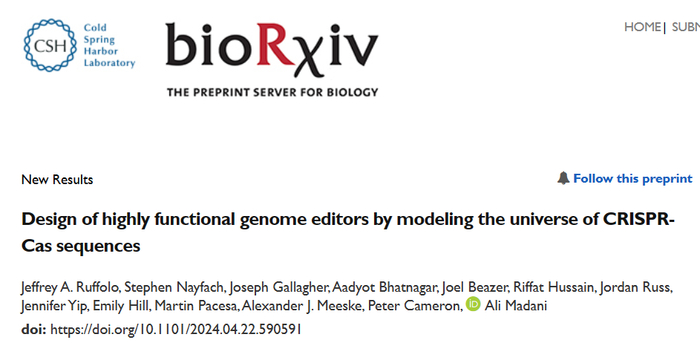 相关研究以「Design of highly functional genome editors by modeling the universe of CRISPR-Cas sequences」为题,于 2024 年 4 月 22 日发布在预印平台 bioRxiv 上。