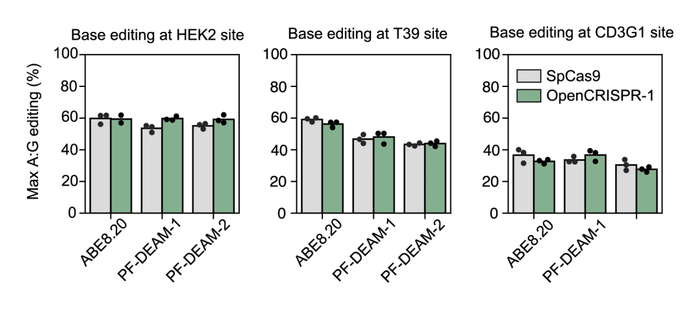 当使用 ABE8.20(一种高活性工程脱氨酶)以及研究生成的脱氨酶 PF-DEAM-1 和 PF-DEAM-2 进行碱基编辑时,OpenCRISPR-1 的功能与 SpCas9 非常相似。