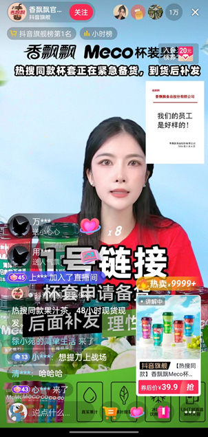 新浪财经注意到,香飘飘抖音旗舰店直播间已上架日本事件同款产品,发稿时直播间登上了抖音旗舰榜首位。主播还表示,“热搜同款杯套正在紧急备货,到货后补发。” 截至发稿,根据飞瓜数据显示,5月5日,香飘飘抖音官方旗舰店销售额达到136.3万元,销量为7.7万,其中Mceo果汁茶产品销售额超125万元。