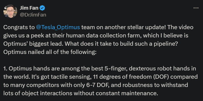 此外,英伟达高级研究科学家、AI Agents 负责人 Jim Fan 对 Optimus 新视频展示出的技能给予了很高的评价。