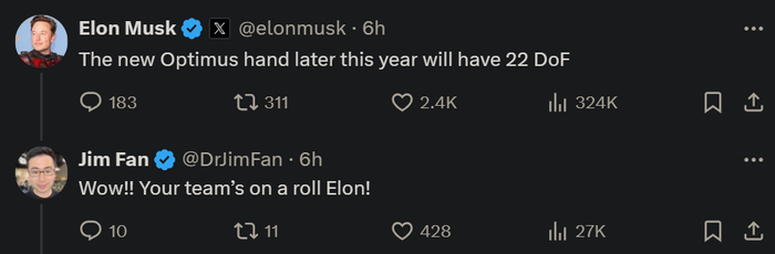 在评论区,马斯克预告了 Optimus 人形机器人手部的最新目标,在今年晚些时候将拥有 22 自由度(DoF)。这就更让人期待一波了。