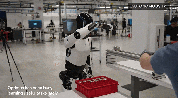 团队训练并部署了一个神经网络,允许 Optimus 开始执行有用的任务,例如从传送带上捡起电池单元并将它们精确地插入托盘中。