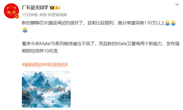 曝华为新麒麟芯片跑分有望突破110万分 Mate70搭载