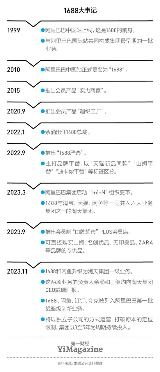 2023年11月,1688在阿里巴巴内部实现了一次地位的“飞升”:它被升级为淘天集团一级业务。当时,阿里巴巴CEO吴泳铭表示,1688是阿里巴巴历史最悠久的业务,服务了中国制造业的主流厂商,具备二次创业的坚实基础和巨大潜力。