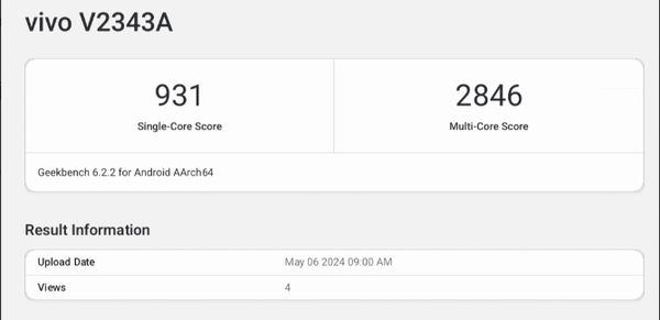 【CNMO科技消息】近日,CNMO注意到,一款型号为“vivo V2343A”的机型现身Geekbench跑分平台,获得了单核981分、多核2846分的成绩。同时,Geekbench平台信息显示,“vivo V2343A”搭载了高通骁龙6 Gen 1移动平台,内置12GB运行内存,支持80W快速充电。