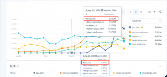 数据监测网站similarweb发布的三月数据中,360AI搜索多个指标优势明显,用户访问的停留时间持续保持在高位,访问量与访客规模增速迅猛。