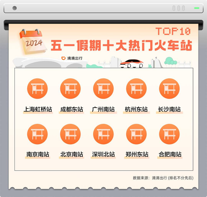 跨城跨省出游带动下,五一假期前往大型交通枢纽的打车需求环比节前上涨73%。从叫车需求量看,上海虹桥站、成都东站、广州南站等领衔今年五一十大热门火车站。