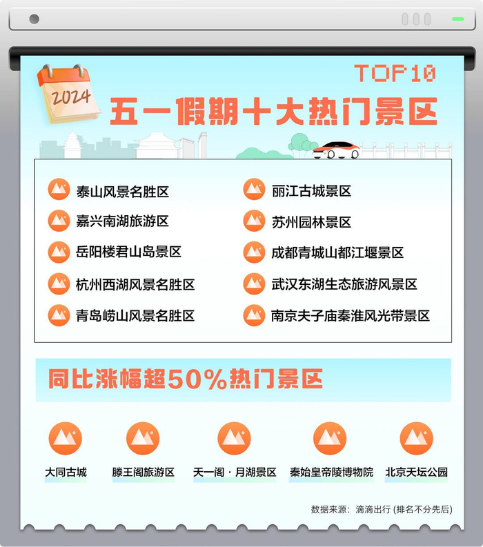 与去年五一相比,大同古城、滕王阁旅游区、天一阁·月湖景区、秦始皇帝陵博物院、北京天坛公园等景区今年打车需求火热,同比上涨均超过50%,其中大同古城的打车需求同比涨幅为114%。