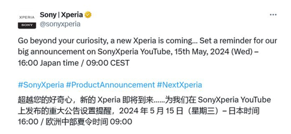 索尼官宣5月15日召开新品发布会 新款Xperia手机将亮相