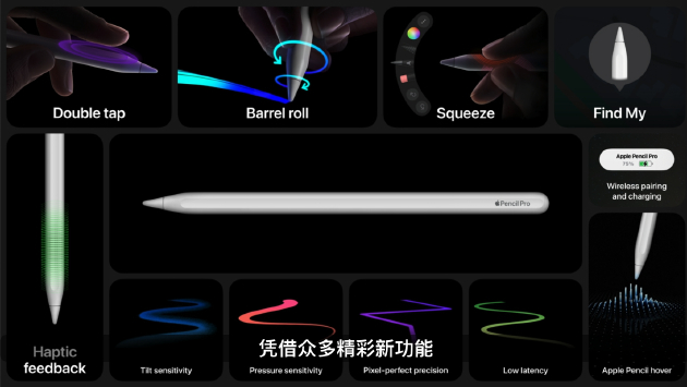 Apple Pencil Pro也如爆料提到那样准时到来,内置新传感器,让它能感受力度和方向,所以有了轻捏、侧旋、触觉反馈,也有了更多新的交互方式,比如捏一下笔,画面上出现调色盘,或者转动一下笔身,笔画能换个方向。