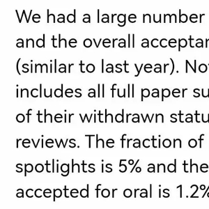 本届会议共收到了 7262 篇提交论文,接收 2260 篇,整体接收率约为 31%,与去年持平(31.8%)。此外 Spotlights 论文比例为 5%,Oral 论文比例为 1.2%。
