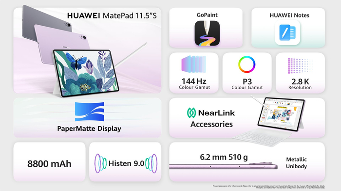 新款华为 MatePad 11.5 英寸 S 平板电脑采用金属机身,厚 6.2mm、重 510g,提供深空灰、冰霜银与紫罗兰三种配色。