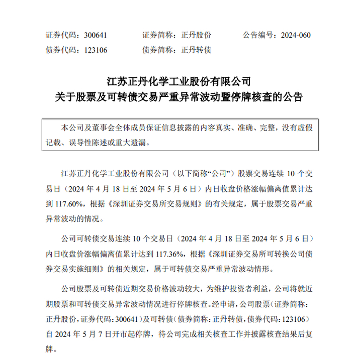 其中,截至5月6日收盘,正丹股份报23.88元/股,股价创历史新高,此前该股长期低于10元。若自2月7日的历史低价算起,至5月6日,正丹股份股价已大涨700%。因公司股票及可转债严重异常波动,正丹股份自5月7日起停牌核查。