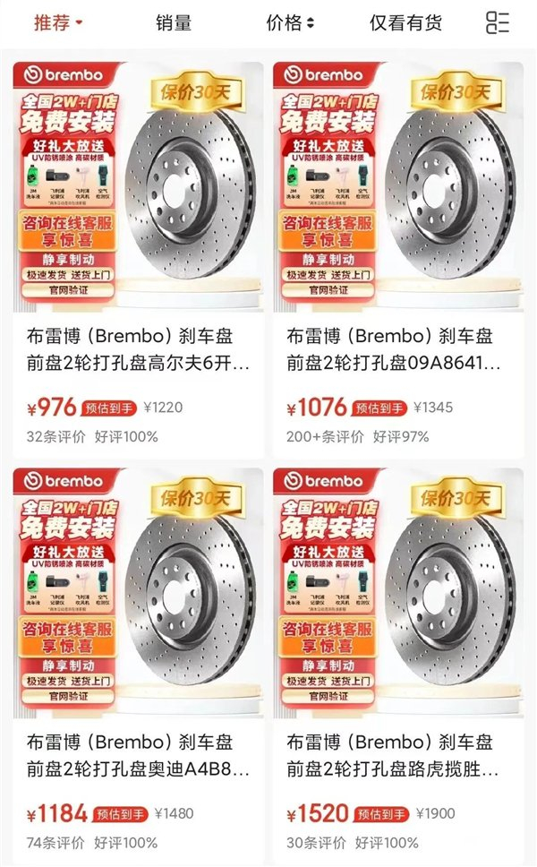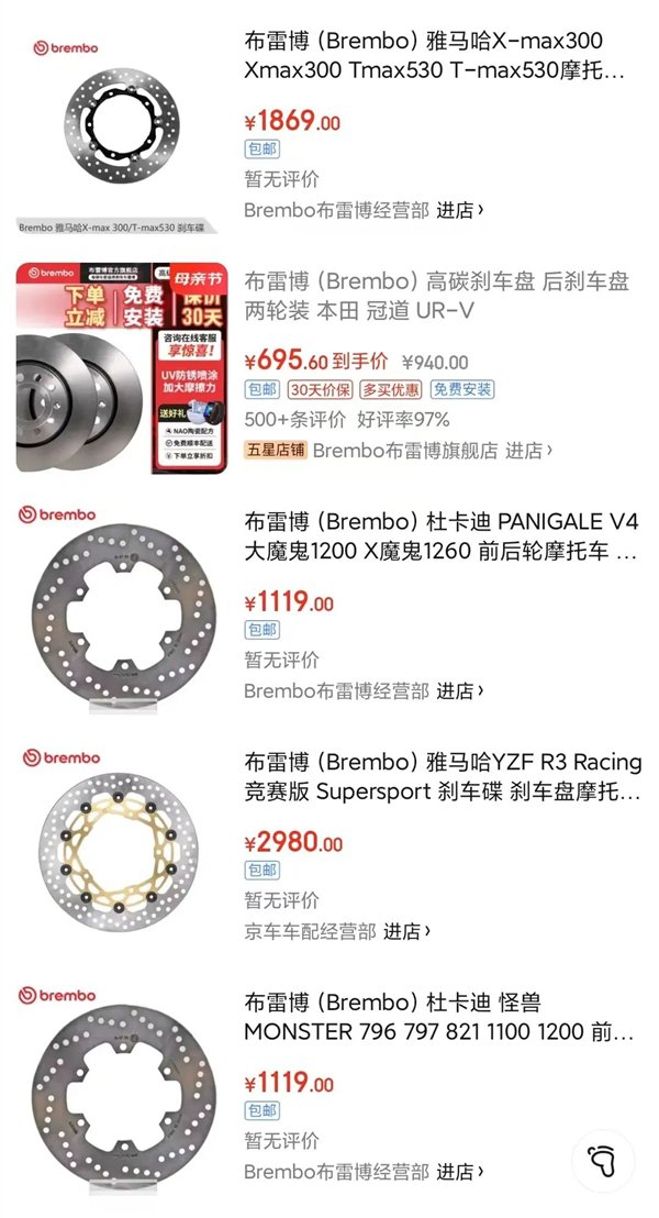 以布雷博( Brembo )为例,摩托专用的一块前盘能上千,而汽车两块尺寸更大的常用铸铁盘也才这个价,还包安装。