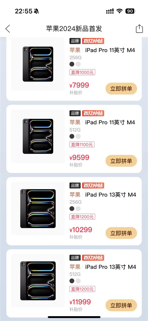 不过,拼多多百亿补贴已经出手,目前已将上线新款iPad Pro系列,全系降价至少1000元。