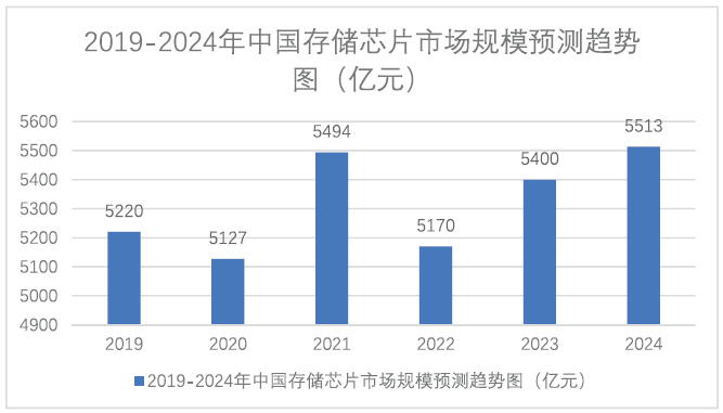 受消费电子市场需求疲软等因素影响,自2021 年以来,存储芯片产业进入长达近两年的下行周期。中商产业研究院发布的《2024-2029 年中国存储芯片行业市场发展监测及投资战略咨询报告》显示,2022 年,我国存储芯片市场规模约5170 亿元,同比下降5.9%,2023年市场规模约为5400 亿元。当前新一轮人工智能浪潮爆发,由AI 服务器带来存储芯片新的增量需求,有分析师预测,2024 年市场规模将恢复增长至5513 亿元。