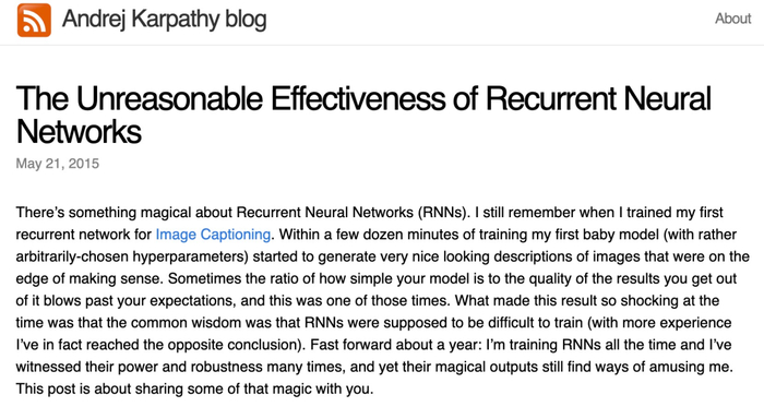 在 RNN 方面,Ilya 首先推荐阅读 AI 大牛 Andrej Karpathy2015 年撰写的一篇博客,强调「RNN 惊人的有效性」。
