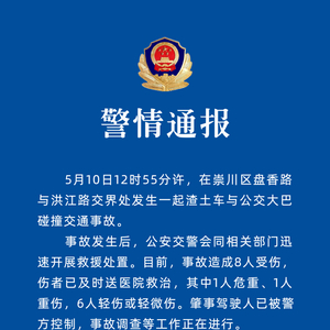 当日下午,南通市公安局交警支队发布通报称,5月10日12时55分许,在崇川区盘香路与洪江路交界处发生一起渣土车与公交大巴碰撞交通事故。事故发生后,公安交警会同相关部门迅速开展救援处置。目前,事故造成8人受伤,伤者已及时送医院救治,其中1人危重、1人重伤,6人轻伤或轻微伤。肇事驾驶人已被警方控制,事故调查等工作正在进行。