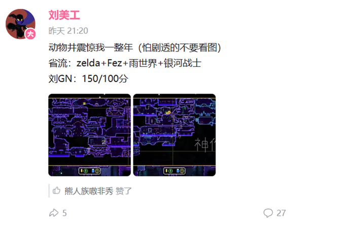 5月9日,类银河恶魔城游戏《动物井》(ANIMAL WELL)一经发售便广受好评,目前本作的Mc均分高达91分,IGN和GameSpot也都给出了9分的高分,国产独游《勇敢的哈克》制作人刘美工更是直接给出了150/100的评价,反正玩过的基本都赞不绝口。