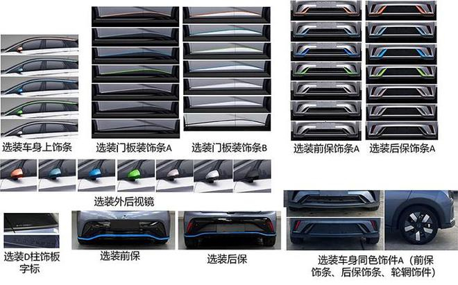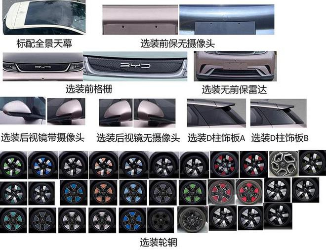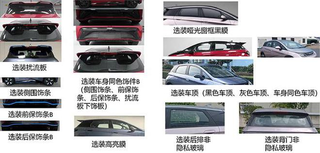 此外,新海豚支持选装前保雷达、不同样式 D 柱装饰板、D 柱饰板字标、前格栅、后扰流板、后排隐私玻璃、不同样式轮辋等配置。