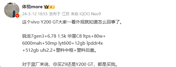IT之家 5 月 13 日消息,vivo Y200 GT 手机将于 5 月 20 日发布。新机正式亮相之前,博主 @体验 more 曝光了其主要参数。