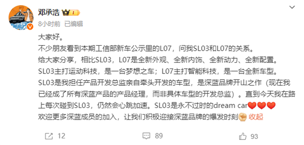 长安深蓝L07申报 CEO:并非深蓝SL03加长换新 是一台全新车型