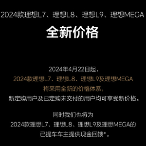 2024年4月22日,理想汽车调整旗下多款车型售价,其中2024款L系列汽车降价1.8~2万元不等(不含理想L6),理想MEGA降价3万元。与此同时,理想也给2024款车型的老车主提供了等额现金退款。