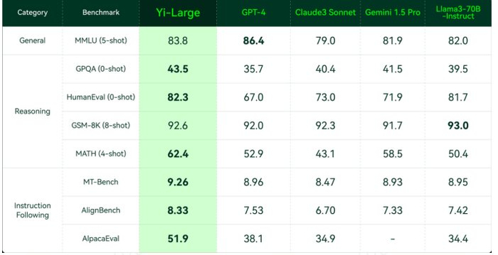 在更全面的大模型综合能力评测中,Yi-Large 多数指标超越 GPT4、Claude3、Google Gemini 1.5 等同级模型,达到首位。在通用能力、代码生成、数学推理、指令遵循方面都取得了优于全球领跑者的成绩,稳稳跻身世界范围内的第一梯队。随着各家大模型能力进入到力求对标GPT4的新阶段,大模型评测的重点也开始由简单的通用能力转向数学、代码等复杂推理能力。在针对代码生成能力的 HumanEval、针对数学推理能力的 GSM-8K和 MATH、以及针对领域专家能力的GPQA等评测集上,Yi-Large也取得了具有绝对优势的成绩。