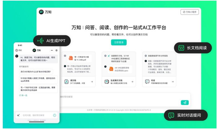 以往发布的大模型 2C 应用大多定位于“聊天机器人”,万知则针对找、读、写三大场景,将通用问答场景作为交互方式,搭配长文档解读、PPT 制作等功能,打造PC/手机多端协同、覆盖工作生活全场景的 “AI-First 版 Office”,为用户提供 AI 2.0 时代颠覆性的办公体验,创始人李开复也亲自担任“首席体验官” 聆听网友反馈。