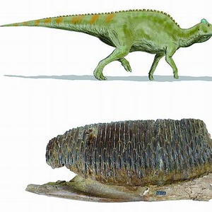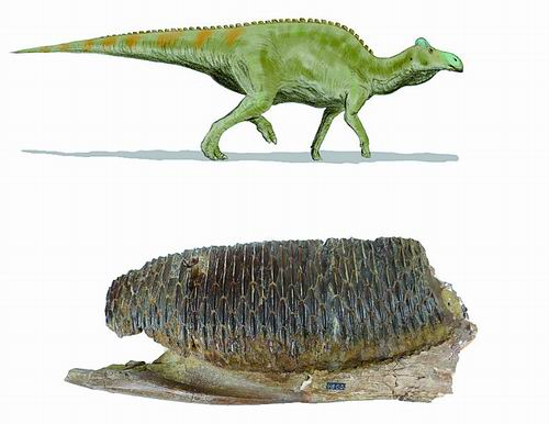 鸭嘴龙类恐龙复原图(上图)及下颌齿照片(下图)。