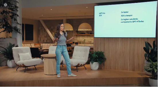 据介绍,GPT-4o里的“o”是Omni的缩写,也就是“全能”的意思。在API使用方面,相比去年11月发布的GPT-4-turbo,GPT-4o价格下降50%,速度提升200%,未来几周内GPT-4o语音和视频输入功能也将随之推出。