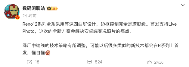 知名数码博主“数码闲聊站”爆料称,OPPO Reno12将全系采用等深四曲屏设计,边框控制可以做到“旗舰级”,并安卓市场首发支持Live Photo,可以解决安卓端无实况照片的痛点。