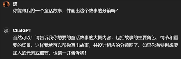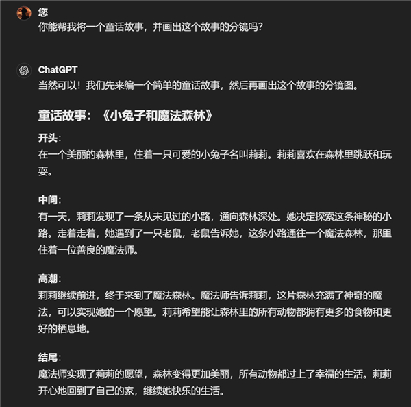 先让它给咱讲一个童话故事,顺便再画出整个故事的分镜图。GPT-4o 没犹豫几秒,库吃库吃就开始写了。
