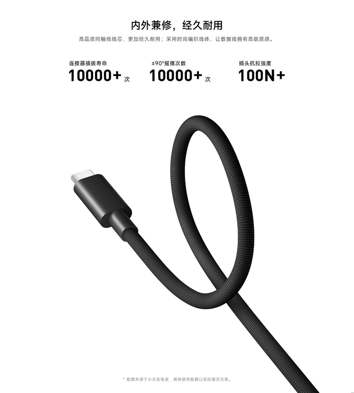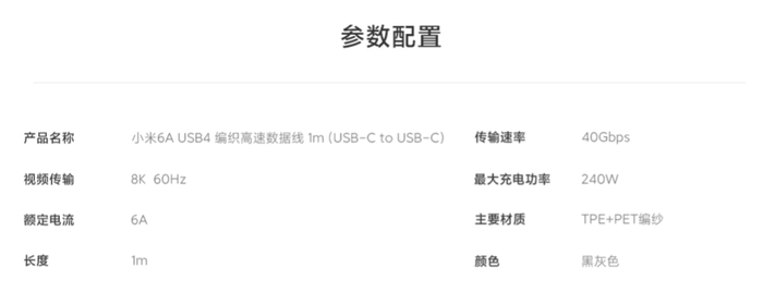 小米 6A USB4 编织高速数据线支持40Gbps USB4、可实现最高 8K 60Hz 视频传输。