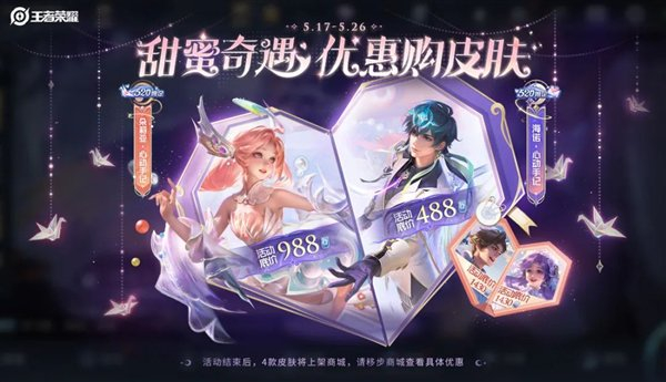 参与【甜蜜奇遇-520皮肤优惠购】活动,5月17日活动开启后-5月26日23:59,最低988点券即可购买皮肤。