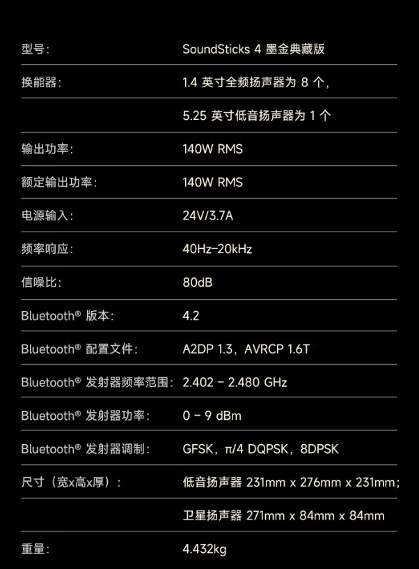 此外,这款音箱支持蓝牙 4.2 技术,同时支持 3.5mm AUX-IN 输入,IT之家附音箱参数信息如下: