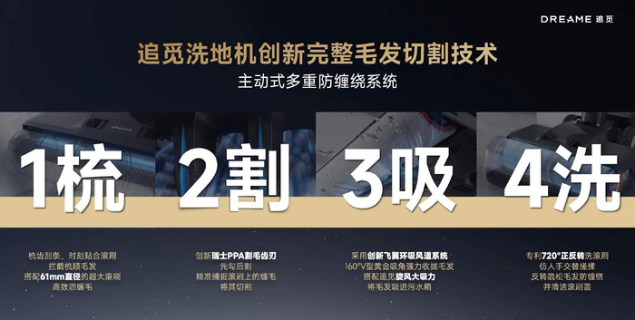 具体来看,追觅主动式0缠毛系统拥有“一梳、二割、三吸、四洗”主动式多重防缠绕系统。“一梳”,恒压梳齿刮条主动实时贴合滚刷,并与滚刷保持60°黄金夹角,用于主动拦截、梳顺毛发,实现高效防缠;“二割”,当有少量毛发缠绕滚刷时,瑞士PPA割毛齿刃拥有的85个密集梳齿,配合61mm直径的超大滚刷,可以主动勾取缠毛将其割断;“三吸”,追觅创新设计的飞翼环吸风道系统,搭配追觅强劲大吸力,彻底吸净毛发无残留;“四洗”,配合追觅专利720°正反转洗滚刷,仿人手交替搓揉,使缠发蓬松被精准勾割,同步清洁滚刷盖,彻底实现滚刷0缠毛。