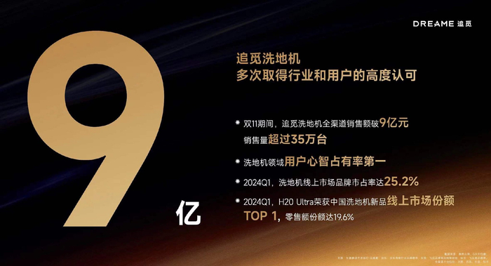 在中国市场,2023年双11期间,追觅洗地机全渠道销售额破9亿元,销售量超过35万台。同时在2023年,追觅科技取得了洗地机领域用户心智占有率第一的成绩。据奥维云数据显示,2024年第一季度,追觅洗地机在国内线上市场份额达25.2%。同时,追觅洗地机H20 Ultra也在第一季度取得了中国洗地机新品线上市场份额TOP 1的成绩,零售额份额达19.6%。
