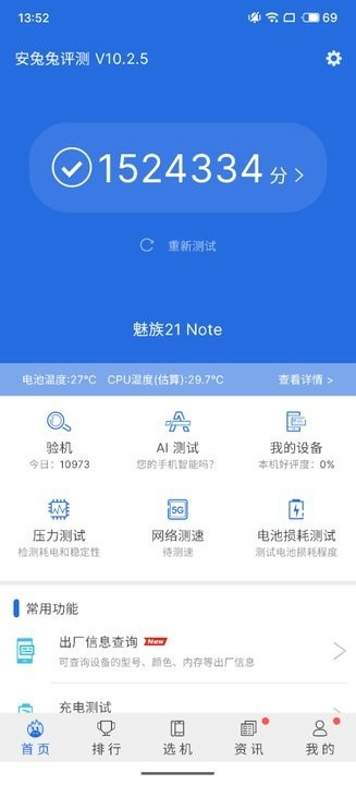 作为一款定位中端市场的产品,在做好差异化设计的同时,性能方面自然同样要做到无短板。在核心配置方面,魅族21 Note采用了第二代骁龙8处理器,并且全系标配16GB的大内存。这样的硬件组合,在当下的中端市场中可以算得上顶尖。我们手中的内存版本为16+512GB,安兔兔跑分实际测试成绩超过152万分。