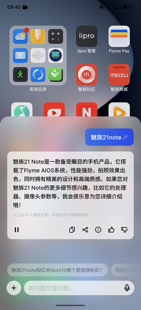 即便是当下我们手中未升级到Flyme AIOS的魅族21 Note,也可以体验到AI的魅力。比如,它可以通过Aicy语音,做到即问即答;AI灵动键可以一键呼出Aicy助手;AI图库可以实现魔法消除、图片扩展以及生成个人写真等功能;AI辅助输入则是可以按照用户的需求生成文案,智能理解聊天对话,一键生成回复建议等。