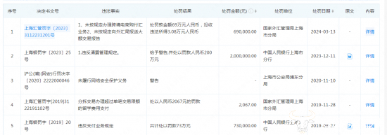 据国家外汇管理局上海分局披露的行政处罚信息显示,通联支付网络服务股份有限公司因未按规定办理跨境电商购付业务,未按规定向外汇局报送大额交易报告,于3月13日被处以罚款69万元,并被没收违法所得3.08万元,总计被罚没72.08万元。