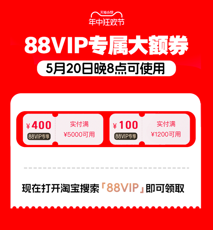 此外,今年天猫618,88VIP大额券的满减门槛,也进一步降低。两档大额券分别为“满5000-400”、“满1200-100”。和去年相比,使用门槛从原先的满1500,下调为满1200即可使用,且两张大额券均可叠加跨店满300-50优惠券和不同行业品类优惠券等。目前,88VIP已可以在淘宝App领取 618大额券。