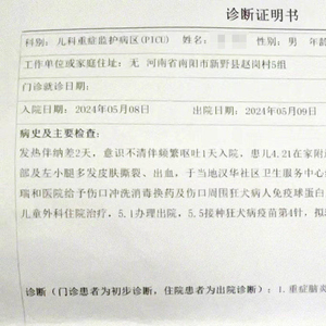 小星在医院的相关诊疗记录显示,4月21日下午,小星在河南省南阳市新野县赵岗村家附近的公路上被狗咬伤,右侧颌面部及左小腿多发皮肤撕裂、出血。小星先是被送到当地汉华社区卫生服务中心,进行了狂犬病疫苗皮下注射;后来又在卧龙区瑞和医院进行了伤口冲洗消毒换药及伤口周围狂犬病人免疫球蛋白皮下注射。之后,又转院至南阳市中心医院住院治疗。5月1日办理出院,5月5日接种狂犬病疫苗第4针,计划在5月19日接种第5针。